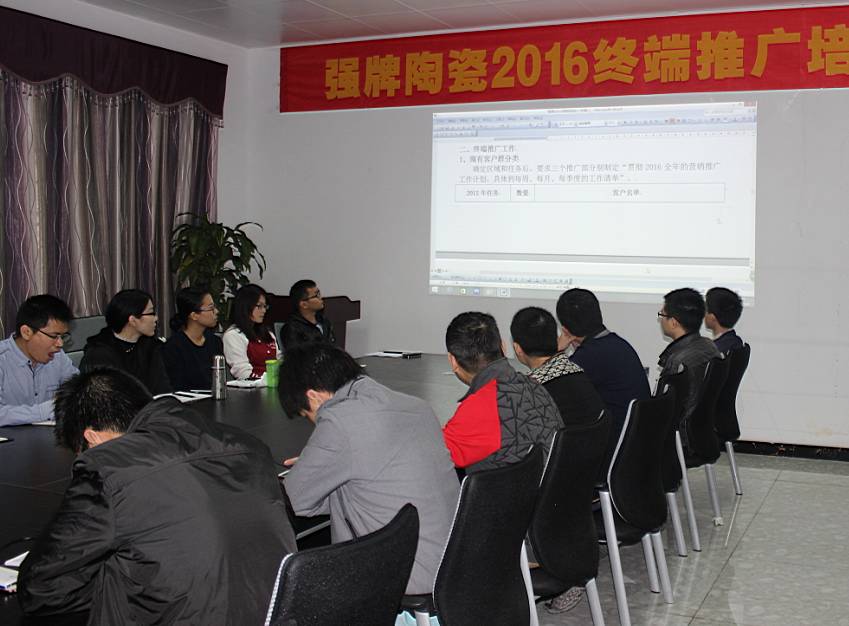 2016年1月4日,强牌陶瓷终端推广部正式成立,品牌总经理林国安以及强牌营销中心推广部、市场部、销售部全体员工共同参与见证了启动仪式,并且同步启动强牌陶瓷2016年终端推广第一阶段特训。