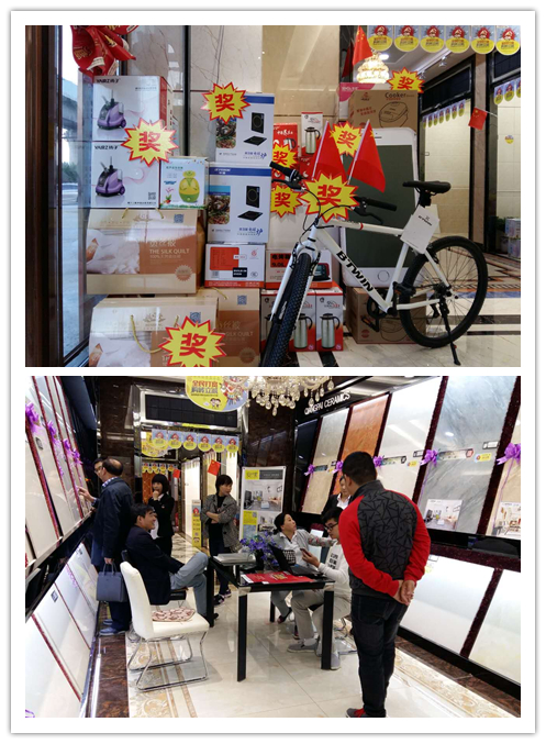 在氛围布置方面,店面布置得热闹喜庆,超值豪华大礼准备就绪,就等业主来抽奖了!